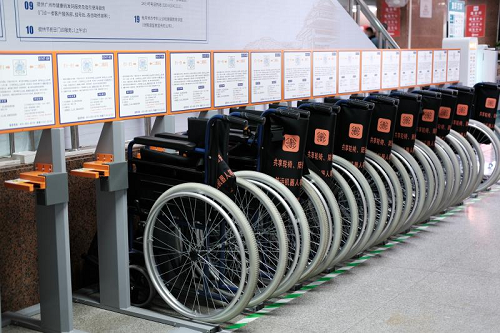 Lapangan terbang, stesen kereta api, dan terminal bas utama biasanya mengekalkan armada kerusi roda manual untuk pelancong. Di Lapangan Terbang Heathrow sahaja, lebih daripada 1,200 kerusi roda disediakan untuk kegunaan awam, dengan kakitangan yang dilatih untuk membantu penumpang apabila diperlukan.